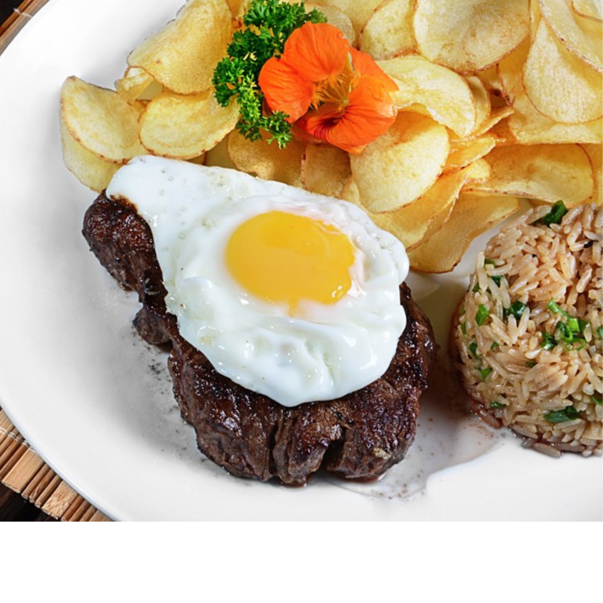 Arroz sujo com 2 carnes diferentes, batata fritas, ovo, jiló